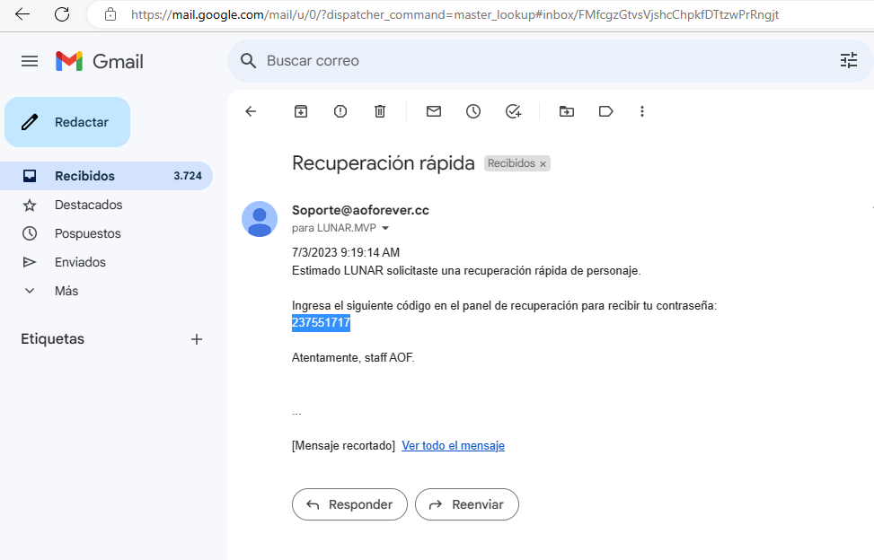 3) Nos dirigimos a nuestro correo electrónico y vamos a la casilla de correos recibidos (a veces puede llegar en la carpeta de correo no deseado) llegará un mail de AOForever con un código único que se deberá ingresar en el juego. El mail se ve asi: